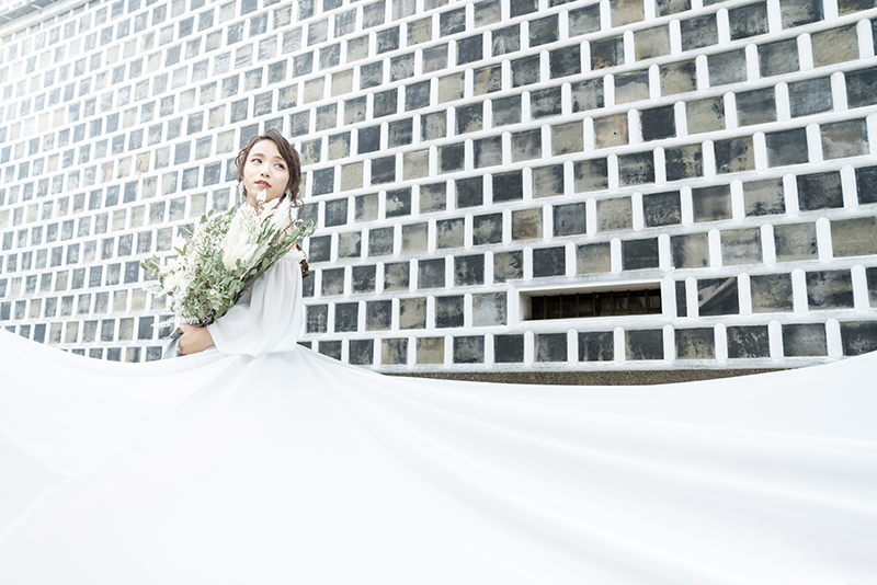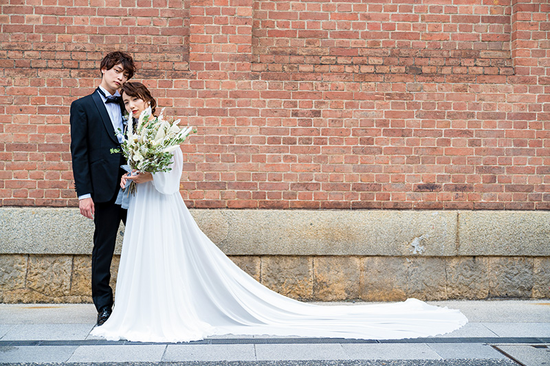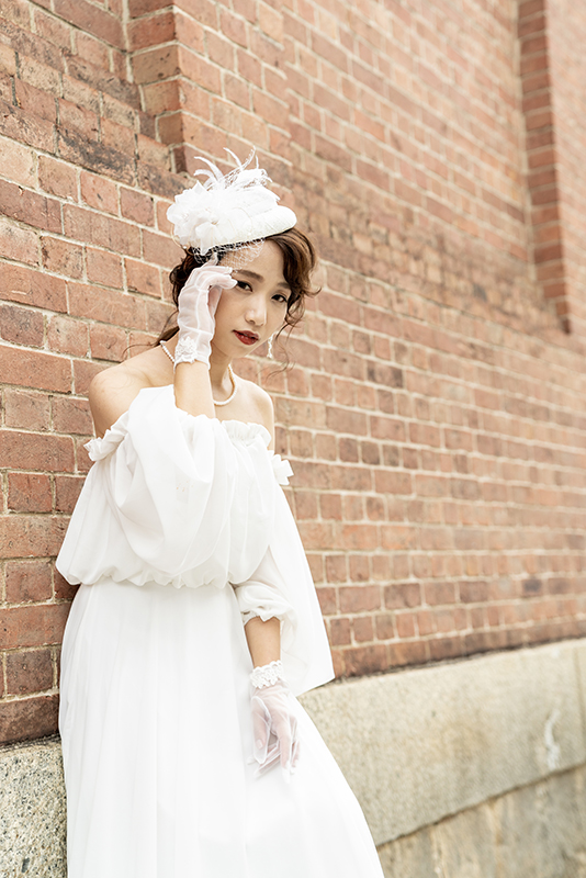 白いドレスは、赤レンガの壁にも よく映えて