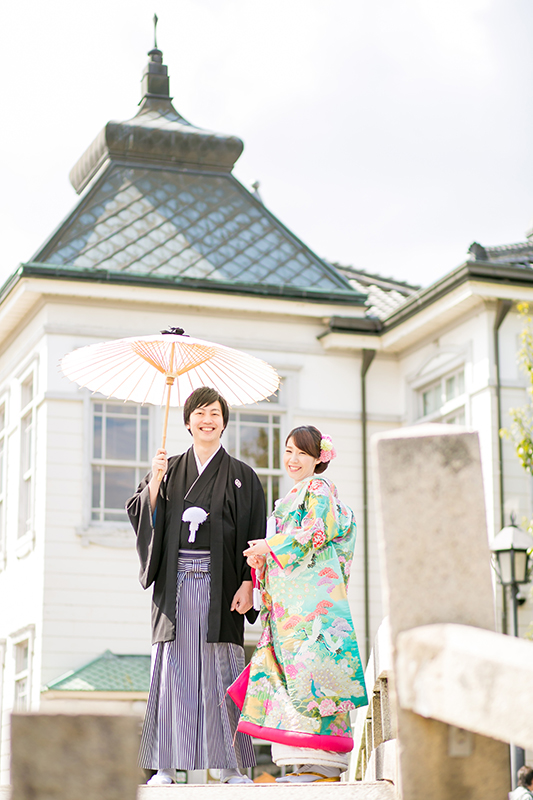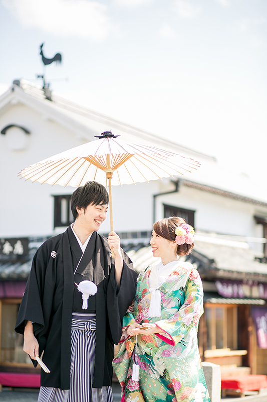 さわやかなグリーンの色打掛がお似合いの新婦様と 紋付羽織袴を堂々と格好良く着こなす新郎様の