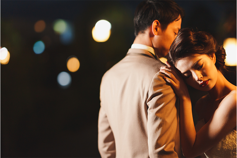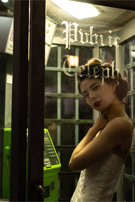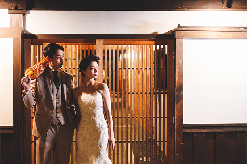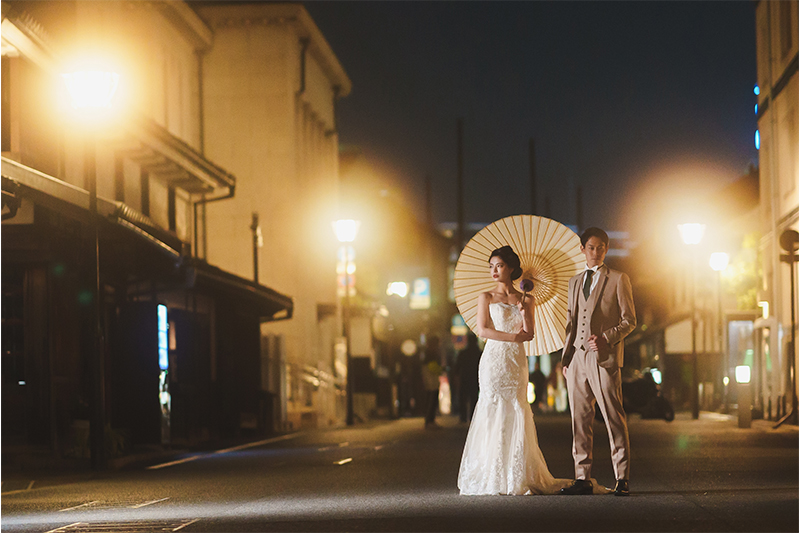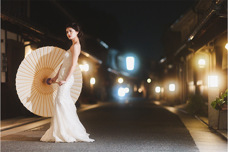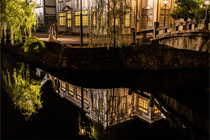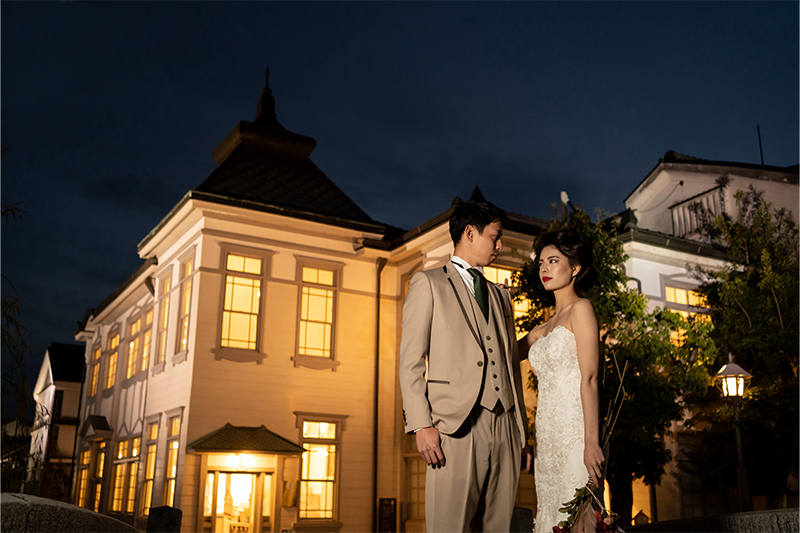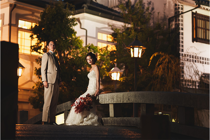 夜になると街並みや洋館のライトアップがより一層ドレスを綺麗に演出してくれます。