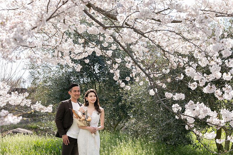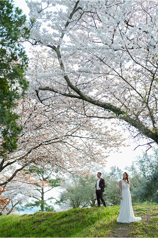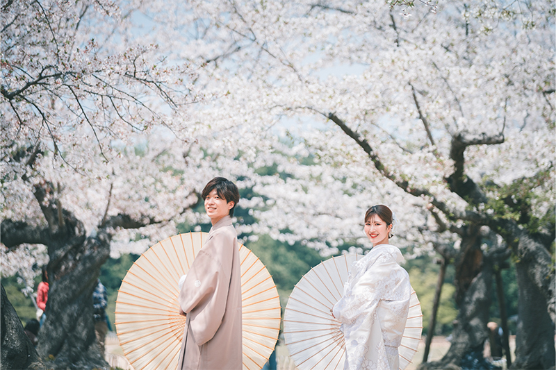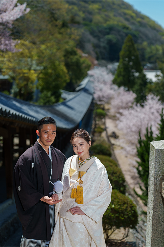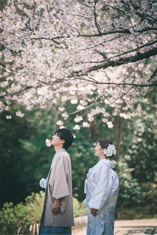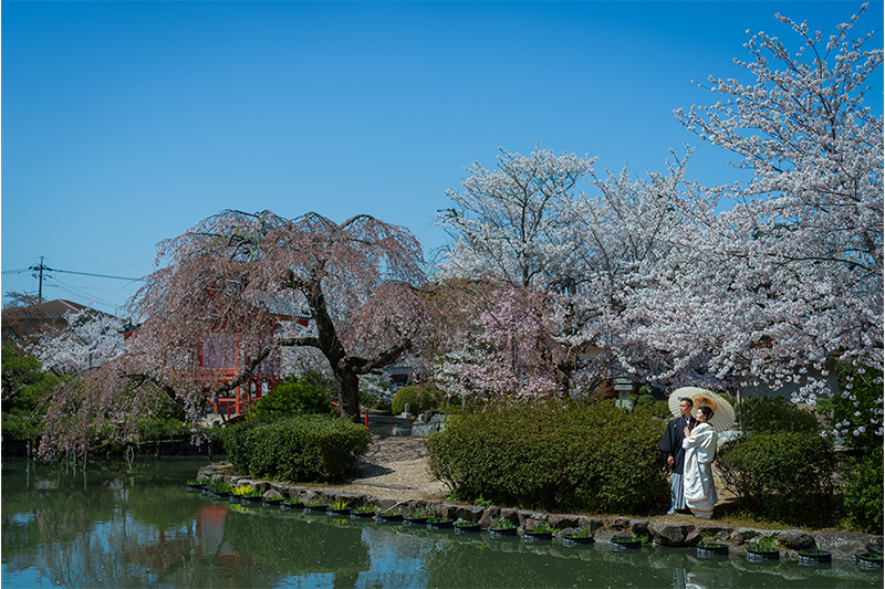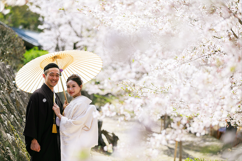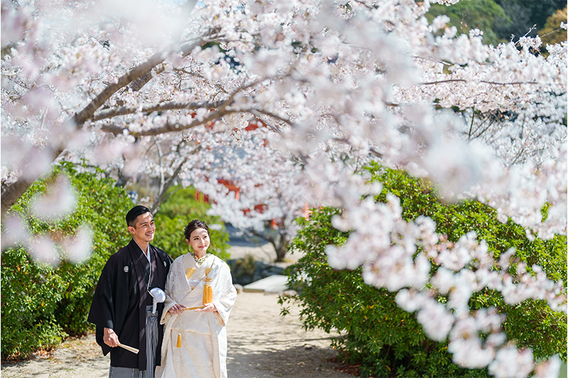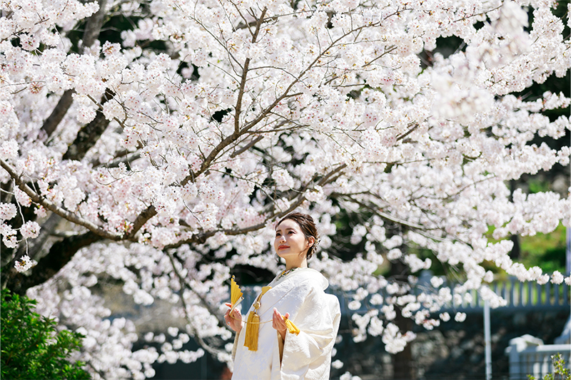 園内に咲く桜がやさしく彩りを添え、白無垢や色打掛の美しさを