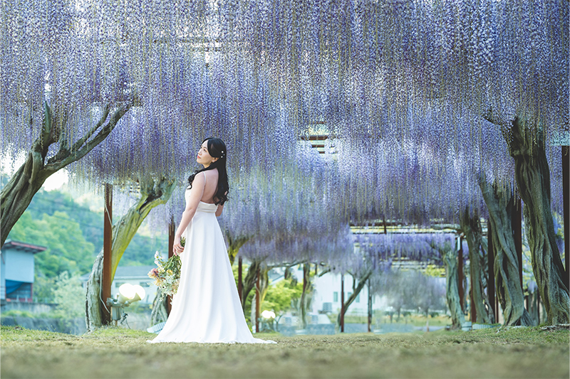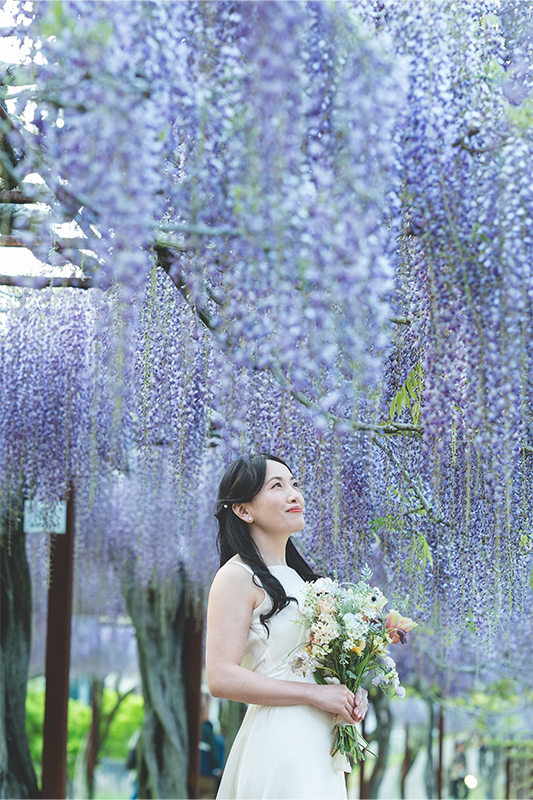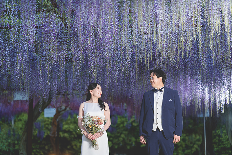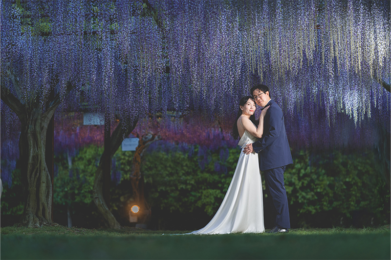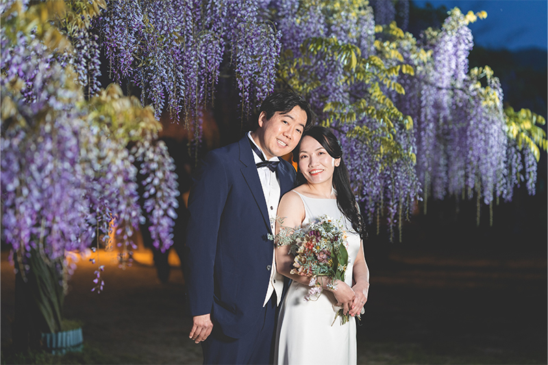 ナイト撮影は、ライトアップされた藤棚がロマンチックな空間に。